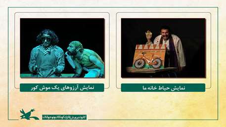 بر همین اساس نمایش «حیاط خانه ما» هر روز به جز روزهای شنبه ساعت ۱۶:۱۵ و «آرزوهای یک موش کور» ساعت ۱۷ در مرکز تئاتر کانون پرورش فکری واقع در پارک لاله تهران اجرا می‌شود.